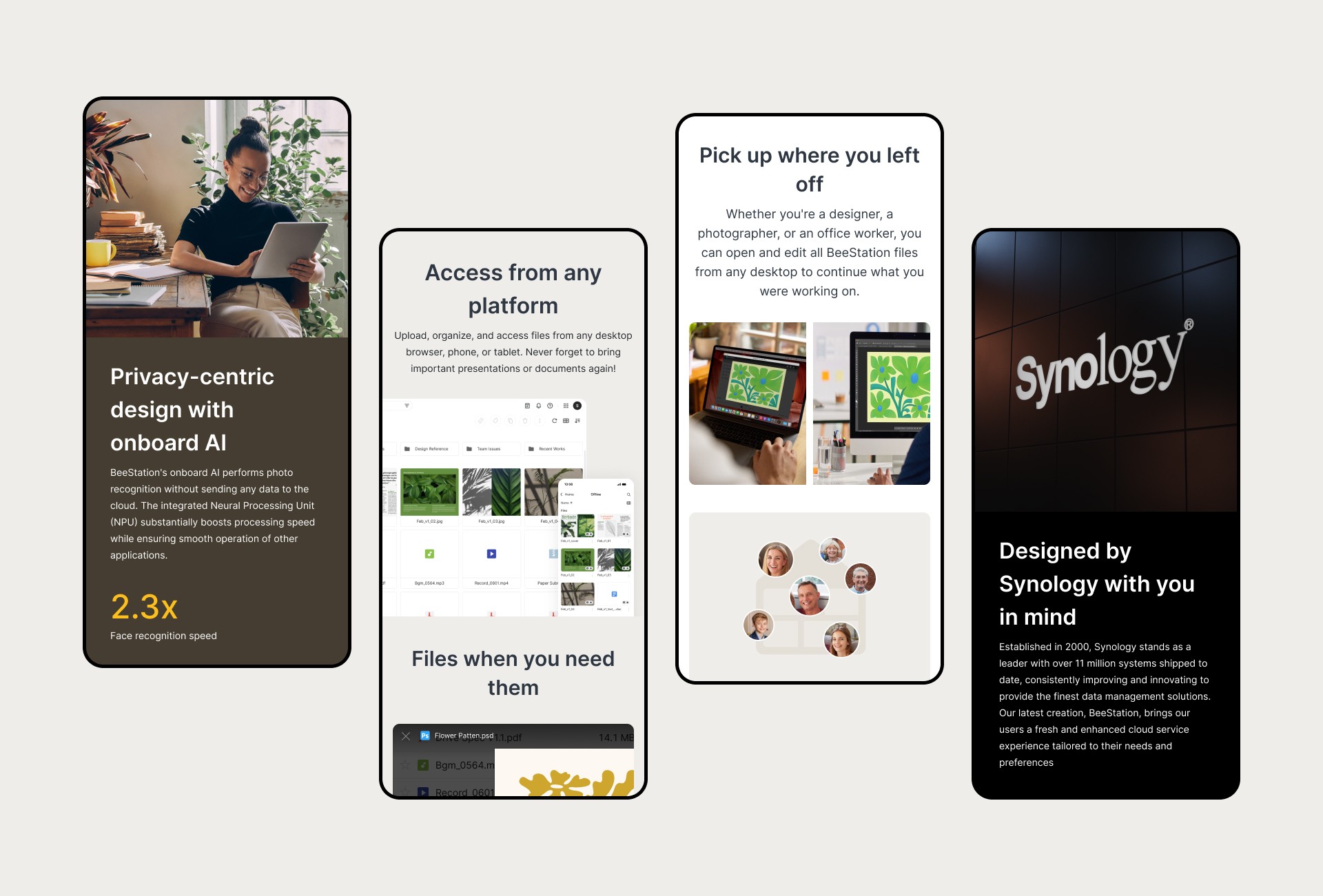 Synology's website had long catered to B2B users and engineers, with a cool-toned color scheme that emphasized functionality. But BeeStation called for a different approach—one that felt approachable and welcoming to a broader audience. The challenge was to shift the brand's tone, spark greater interest, and encourage visitors to stay longer and explore. 従来のSynologyのウェブサイトは、主にBtoBおよびエンジニアをターゲットとしており、冷色系で中性的なデザインを多く採用し、機能性を強調してきた。一方、今回は製品に親しみやすさを感じてもらうことを重視し、より多くの人がサイトに興味を持ち、滞在時間が増えるよう工夫されている。