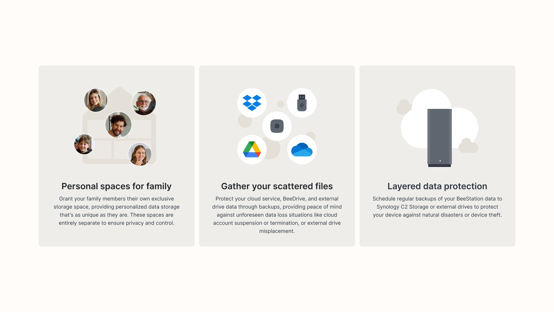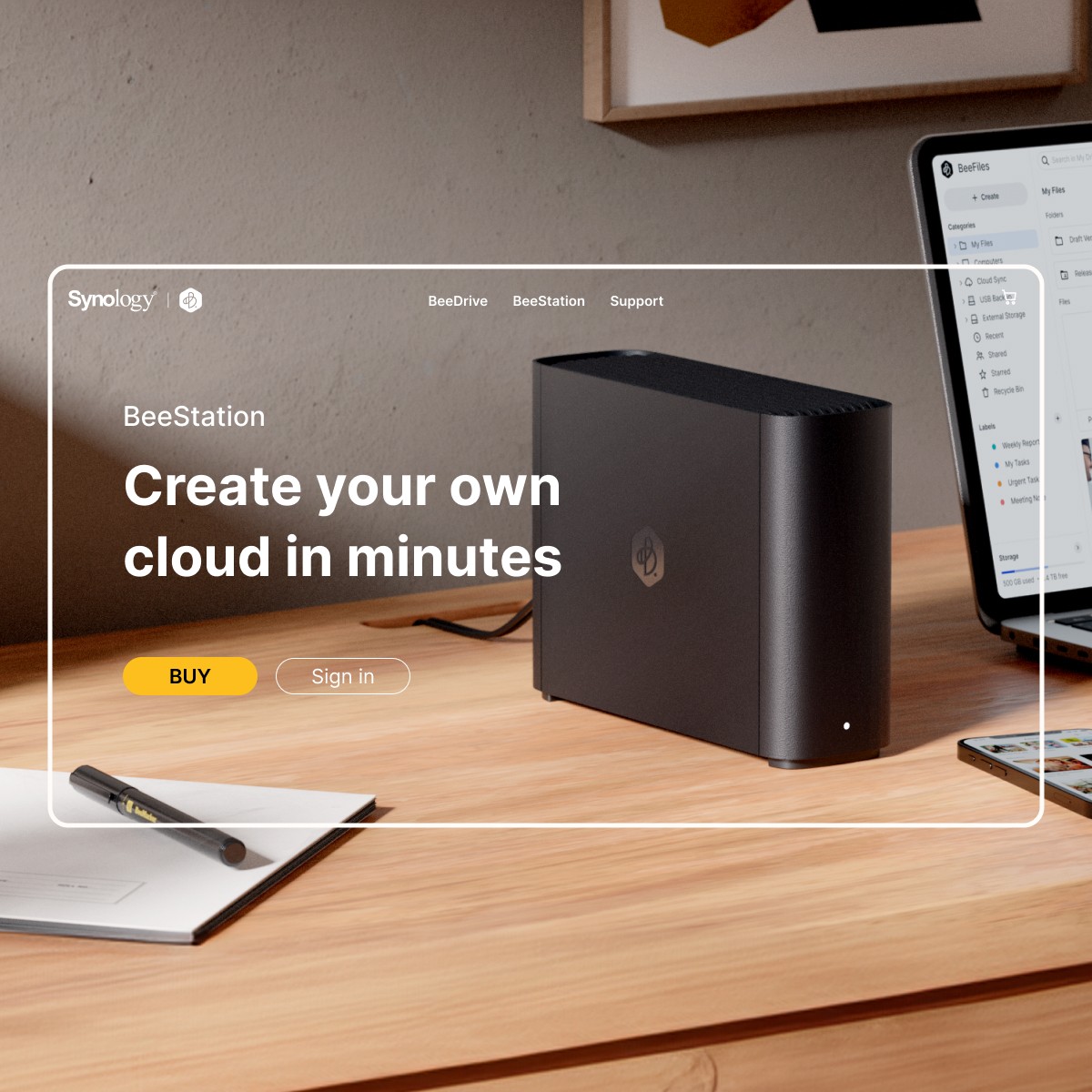 BeeStation by Synology is a hard disk with a network connection. It combines local and cloud backup features, eliminating the need for multiple hard drives while significantly reducing the risks of data loss and network security threats. BeeStationは、Synologyが開発したネットワーク接続対応のハードディスクです。ローカルとクラウドバックアップ機能をひとつに統合し、複数のハードディスクを必要とせずに、データ損失やネットワークセキュリティ上のリスクを大幅に軽減します。