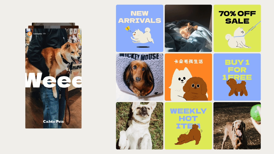 The challenge was finding the right balance—conveying Caldo Pets' trustworthiness while keeping the brand approachable and warm. We landed on a core idea: "Healthy meals support vibrant lives." By showcasing pets at their happiest and healthiest, the visuals became a natural expression of the brand's mission. As a solo operation, consistency was critical. We built a design system in Google Docs—a simple foundation that anyone could follow, designer or not. This ensured that no matter who contributed, the brand's look and feel remained cohesive and true to its identity. Caldo Petsの信頼性と親しみやすさをどのように表現するかを検討し、「健康的な食事が元気な暮らしを支える」というアイデアを取り入れた。元気に過ごすペットの姿を健康の象徴として描くことで、Caldo Petsのブランドミッションを伝えている。 また、個人事業主として運営しているため、誰が制作に関わっても一貫した品質を保てるよう、基盤づくりとしてGoogleドキュメント上でデザインシステムの構築に注力した。非デザイナーであっても、ブランドイメージに一体感を持たせた制作が可能となるよう配慮している。